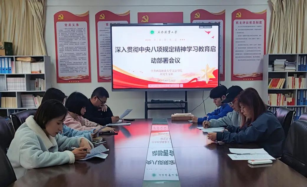为深入贯彻中央八项规定精神,进一步增强支部全体党员的政治意识和纪律意识,3月31日,公司研究生党支部于文法楼305开展深入贯彻中央八项规定精神学习教育启动部署会议。研究生党支部全体党员参加会议,会议由党支部副书记周文主持。会议伊始,研究生党支部全体党员一同学习了中共中央办公厅印发的《关于在全党开展深入贯彻中央八项规定精神学习教育的通知》以及习近平总书记关于中央八项规定的重要论述。随后,党支部纪律委员孙宇带领全体党员同志一同深入学习了中央八项规定的主要内容。会议还对党支部近期需要完成的发展党员队伍、严肃党支部会议纪律等事项进行了讨论,并以公司内其他先进党支部为标杆,从自身摆问题、找差距,进一步明确了党支部下一步工作方向。最后,党支部书记宋向杰对会议进行了总结,他强调党支部全体党员务必要保持求真务实的作风,将中央八项规定精神落实到党支部工作和日常学习生活中,精简党支部会议文件,切实改进党支部会议文风。 通过本次会议,全体党员对中央八项规定有了更深层次的理解和把握,同时也让所有党员对党支部的下一步工作方向有了更为清晰的认知和了解,为研究生党支部后续工作的扎实开展奠定了良好基础。