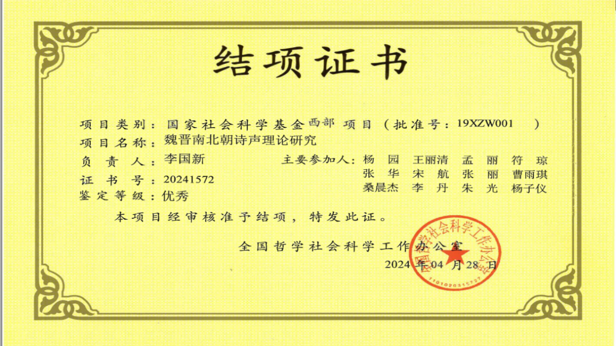 近日,全国哲学社会科学工作办公室发布2024年4月国家社科基金结项情况。据悉,此次共验收571项,33项结项成果被评定为“优秀”。其中,威廉体育官方网站李国新副教授主持的《魏晋南北朝诗声理论研究》(批准号:19XZW001)结项成果被鉴定为“优秀”。该项目是本批次云南省唯一获得“优秀”结项的项目,也是公司首个获得“优秀”结项的国家社科基金项目。