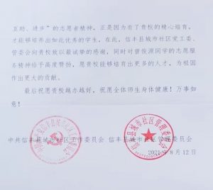 2021年暑期,新冠肺炎呈现多点散发、局部爆发的态势,威廉体育官方网站2020级法学专业曾俊源和郎溪同学,在返乡疫情防控志愿服务工作中表现突出,分别受到江西省赣州市丰县城市社区和镇雄县坪上镇政府的充分肯定,对公司育人工作的成效表示感谢。