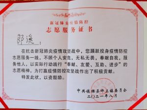曾俊源同学主动请缨,积极参与江西省赣州市丰县城市社区的志愿服务活动。在这期间,他不计酬劳,每天拨打数百个电话,催促未接种疫苗居民尽快接种;昼夜不停,坚持上门走访摸排,登记城区居民疫苗接种情况;尽职尽责,在各小区门口和商铺张贴“赣通码”;不畏风雨,在小区出入口设置卡扫码测温……